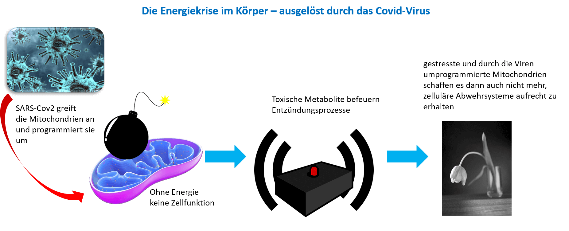 Sind die Mitochondrien geschädigt bricht die Energieproduktion ein. Toxische Metabolite befeuern Entzündungsprozesse mit Zytokonsturm, Aktivierung des Inflammasome sowie Autoimmunität.